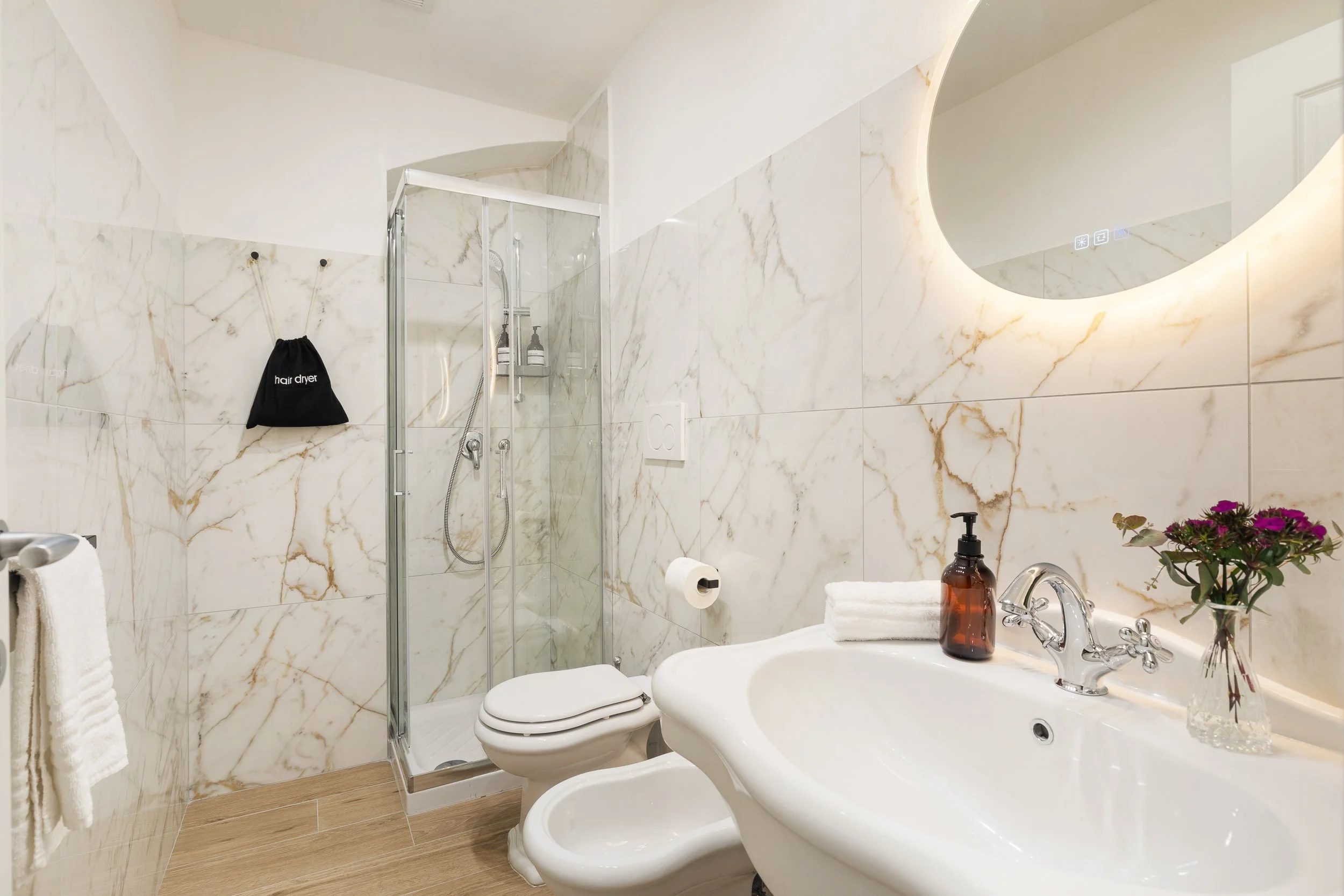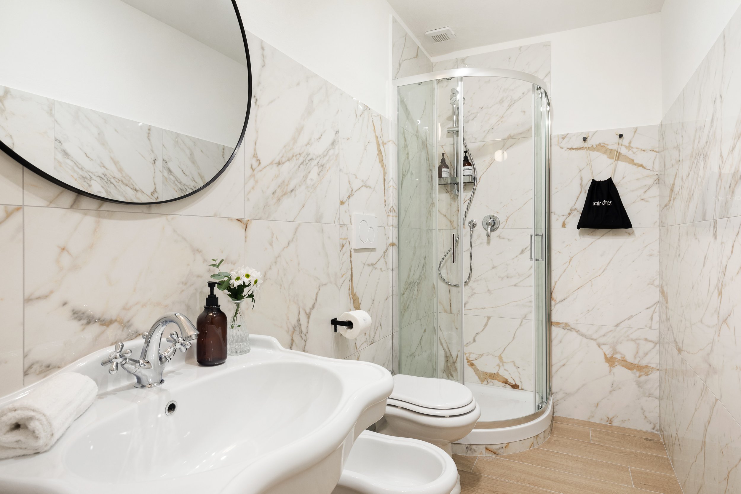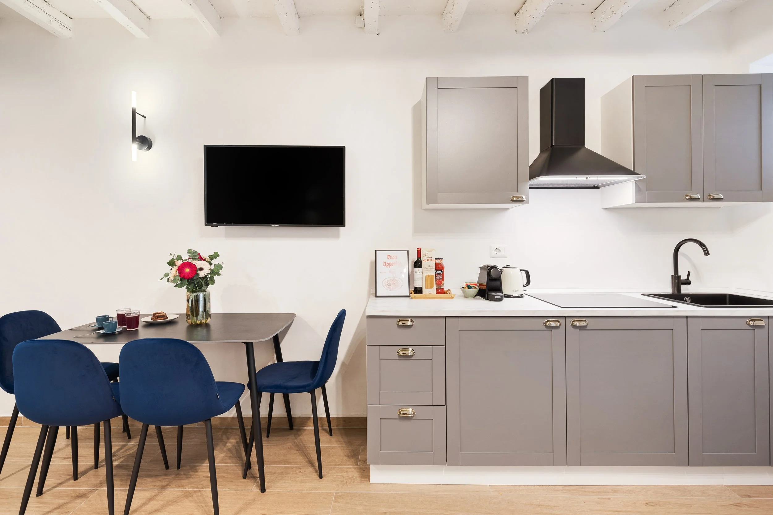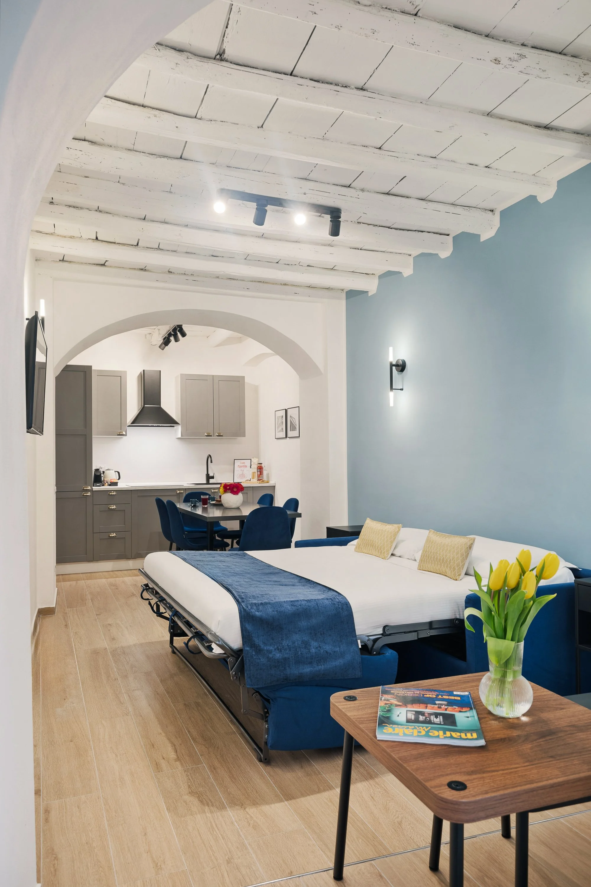 Una delle tre unità dispone anche di una terrazza privata, uno spazio intimo dove godersi un aperitivo o una colazione all’aria aperta, sotto il cielo di Roma. Un dettaglio che rende il soggiorno ancora più speciale.