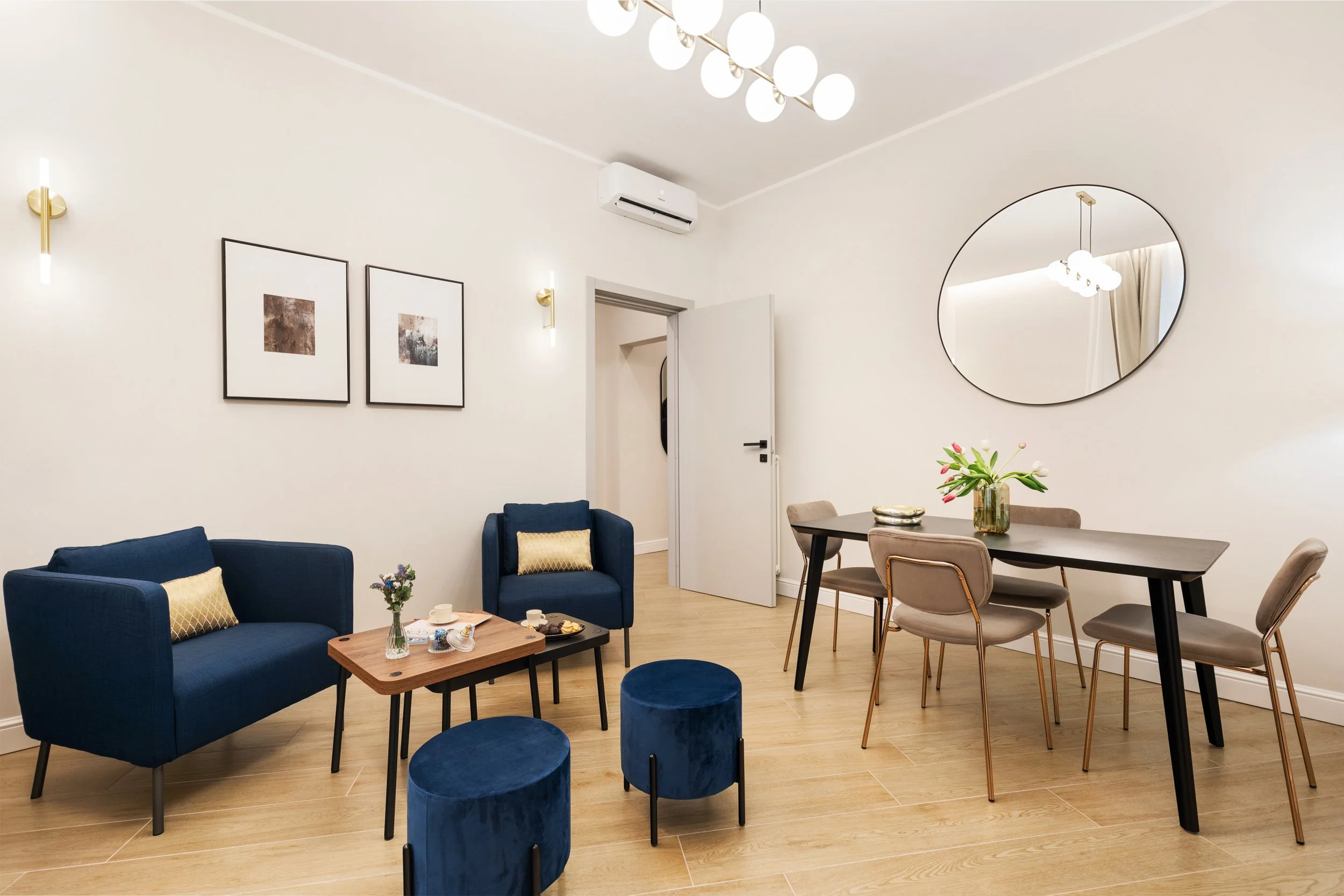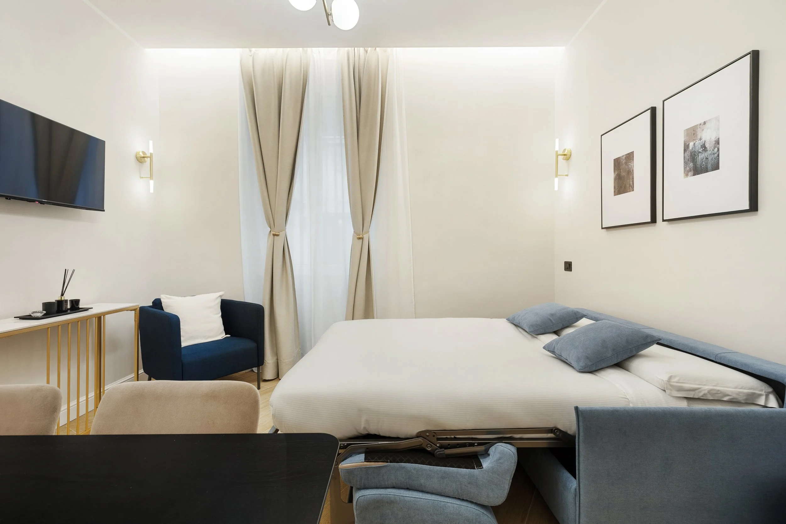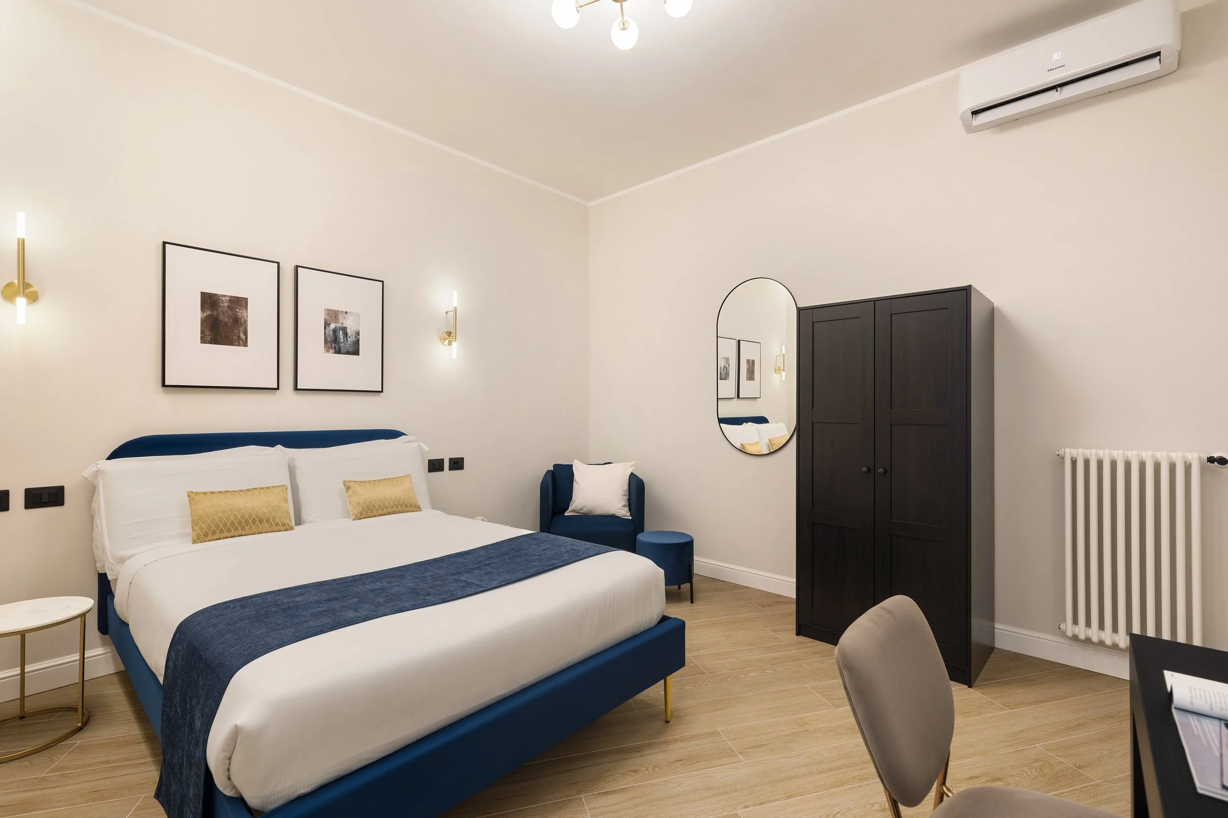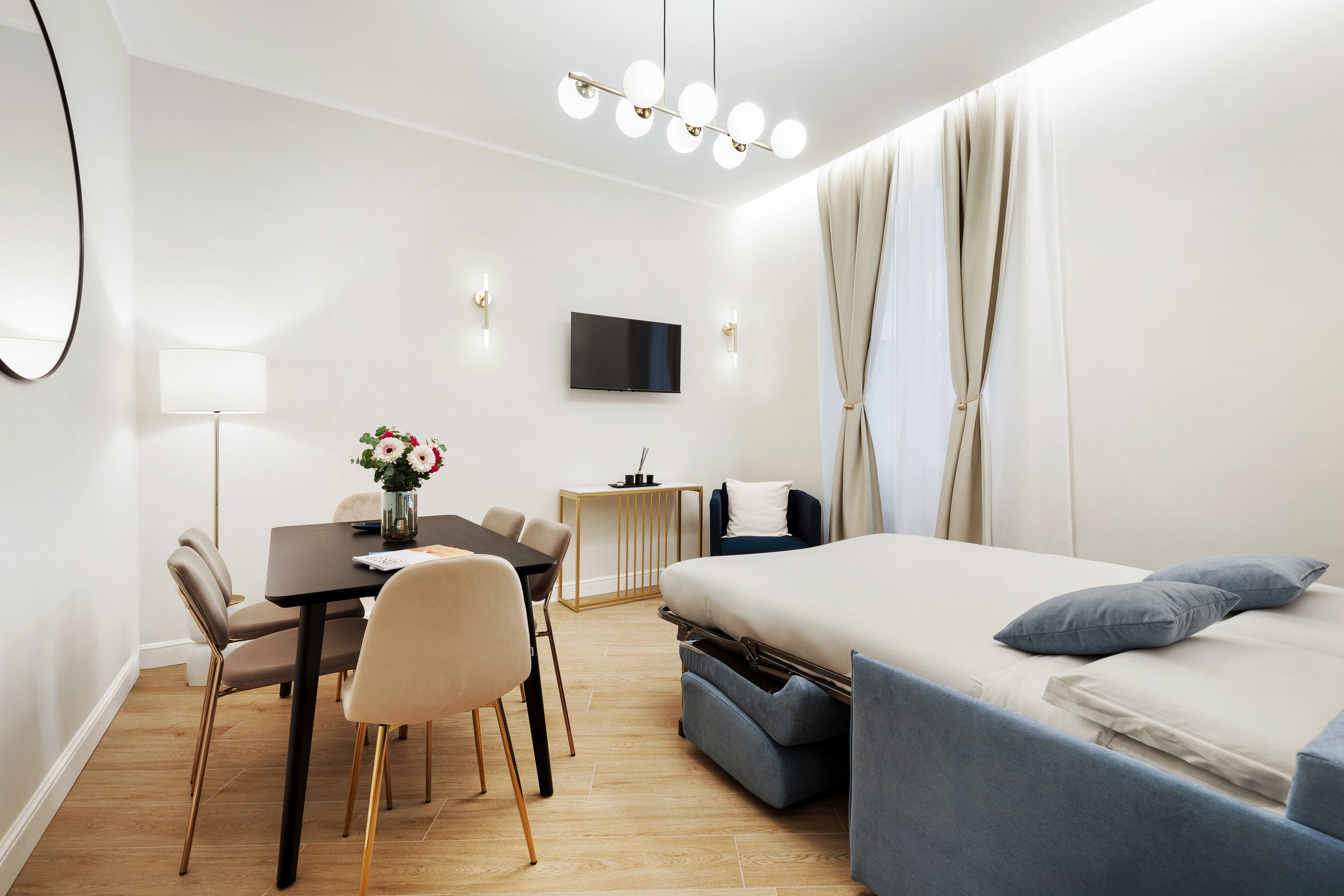 Gli arredi sono moderni e sobri, con toni neutri, materiali naturali e dettagli curati che creano un’atmosfera rilassante e accogliente. Ogni spazio è pensato per garantire funzionalità e benessere, anche per soggiorni più lunghi o in smart working.